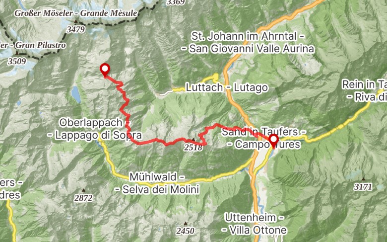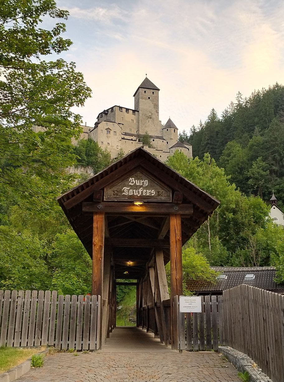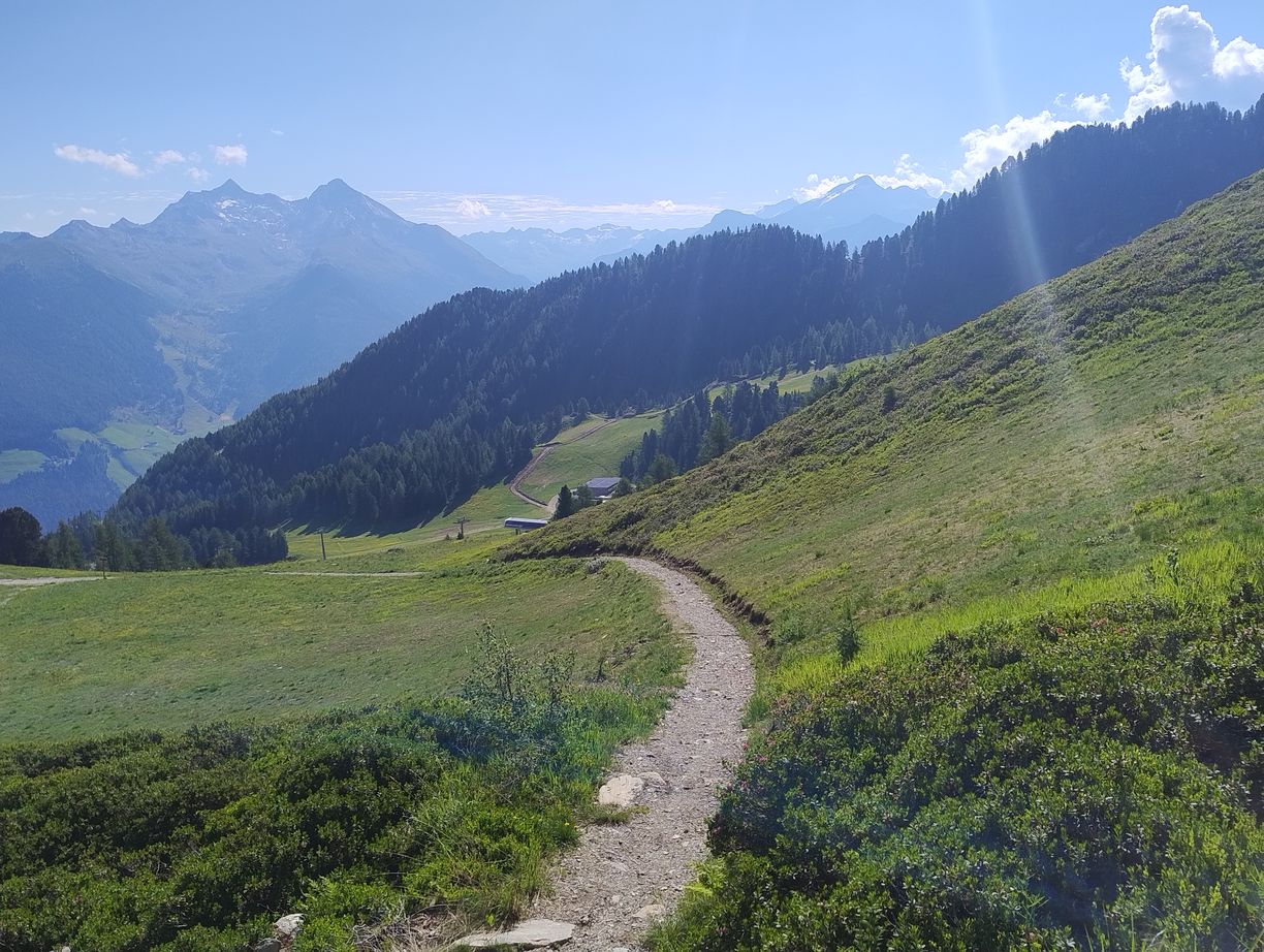 La journée s’annonçant longue et une fois encore très chaude, il est donc pour moi impératif devant ce défi de me laisser de la marge et de passer le gros de la difficulté « à la fraîche ». Ainsi dès 6h30 après avoir remonté la rivière Aurino, puis dépassé l’imposant château-fort de Taufers (que par fainéantise nous ne sommes pas allés voir hier), je me trouve au pied de la grimpette, devant un panneau peu engageant m’annonçant le sommet (Speikboden) à 5h30. J’enfile alors le bleu de chauffe, et pars avec l’idée que tout ce que je pourrais laisser derrière moi dans les 2 prochaines heures -avant que la température ne monte- sera un bonus et ne sera plus à faire…J’emprunte d’abord un bout de route, puis parmi les multiples chemins qui rejoignent la station de ski j’opte pour le sentier 27. Celui-ci présente l’avantage de ne pas être trop raide et d’offrir une montée régulière (pour ne pas dire monotone), me permettant de conserver un bon rythme d’ascension sans pour autant affoler le cardio. Pour passer le temps je me mets non pas à chanter, mais à compter dans ma tête les innombrables lacets, multipliant le chiffre par x, (x représentant le nombre de mètres de dénivelé moyen que j’estime gagner à chaque virage). Puis évidemment finis par m’embrouiller et perdre le compte exact, tandis qu’avec l’effort physique ma lucidité baisse. Voilà pourquoi quand on aime on ne compte pas.
