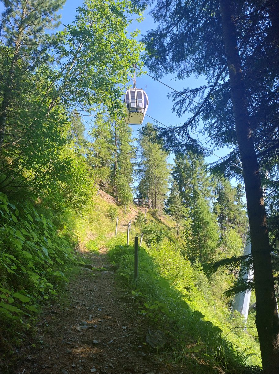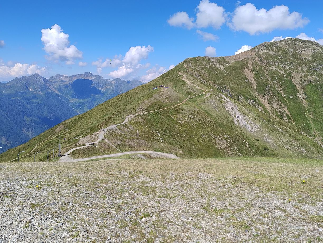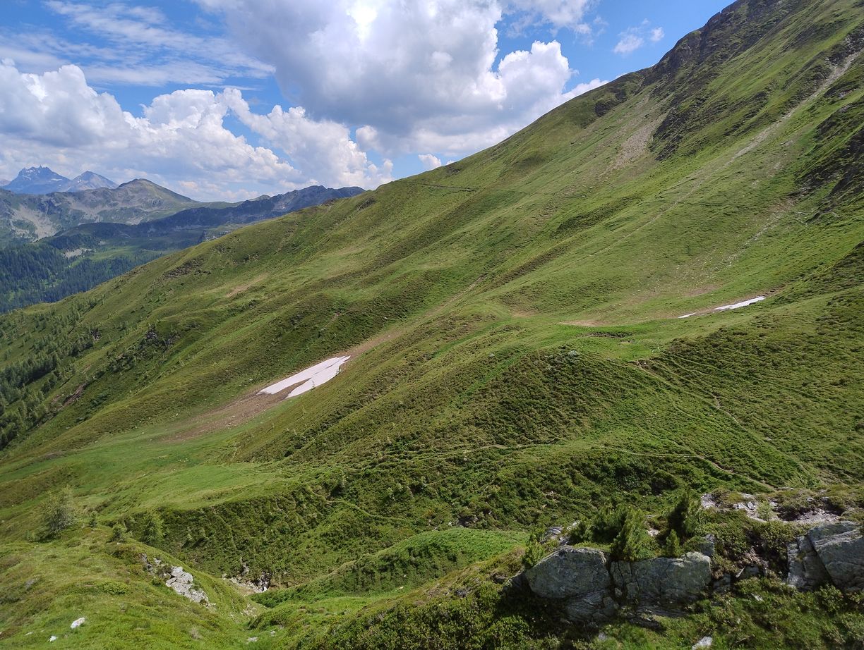 Les minutes puis les heures s’égrènent et peu avant 9h je passe sous les pylônes de télécabine puis atteins un premier plateau (Speikboden alm). J’ai bien carburé avec 1000 mètres d’ascension en à peine plus de 2 heures. Trop peut-être car alors que j’aperçois au loin les bâtiments de la station de ski, qui ont ici remplacé les alpages, mes intestins entrent en zone de turbulence. Je passe les détails de la visite dans le sous-bois qui s’ensuivra, et dont je ne ressors pas entièrement requinqué. Je ressens une certaine faiblesse qui doit aussi affecter mon jugement car pour une raison inconnue, j’oublie complétement mon plan de prendre de l’eau à la station, et me lance directement dans la seconde partie de l’ascension. Les 400 mètres de montée supplémentaires jusqu’aux crêtes, en plein soleil et avec le ventre qui commence à gargouiller à nouveau seront particulièrement pénibles. J’ai l’impression que mes jambes ne me portent plus. A coups de mini-pauses pour souffler je me traîne tant bien que mal en haut, espérant trouver le secours de toilettes à un restaurant d’altitude situé à l’arrivée d’un télésiège. Espoir douché lorsque je découvre un bâtiment fermé et en rénovation. A moins de trouver une source, il va me falloir faire avec l’eau qu’il reste jusqu’au bout…Et pour l’autre affaire, je vais devoir en ces lieux très fréquentés marcher encore 1.5km sur la crête, pour finalement trouver un coin échappant au regard des nombreux parapentistes qui virevoltent au-dessus du sommet du Speikboden (2518m).