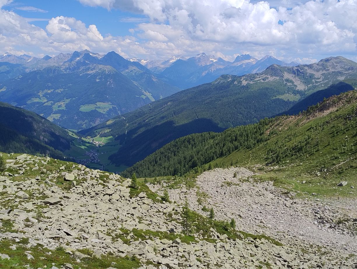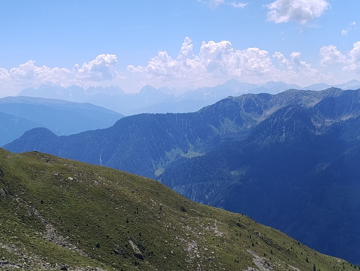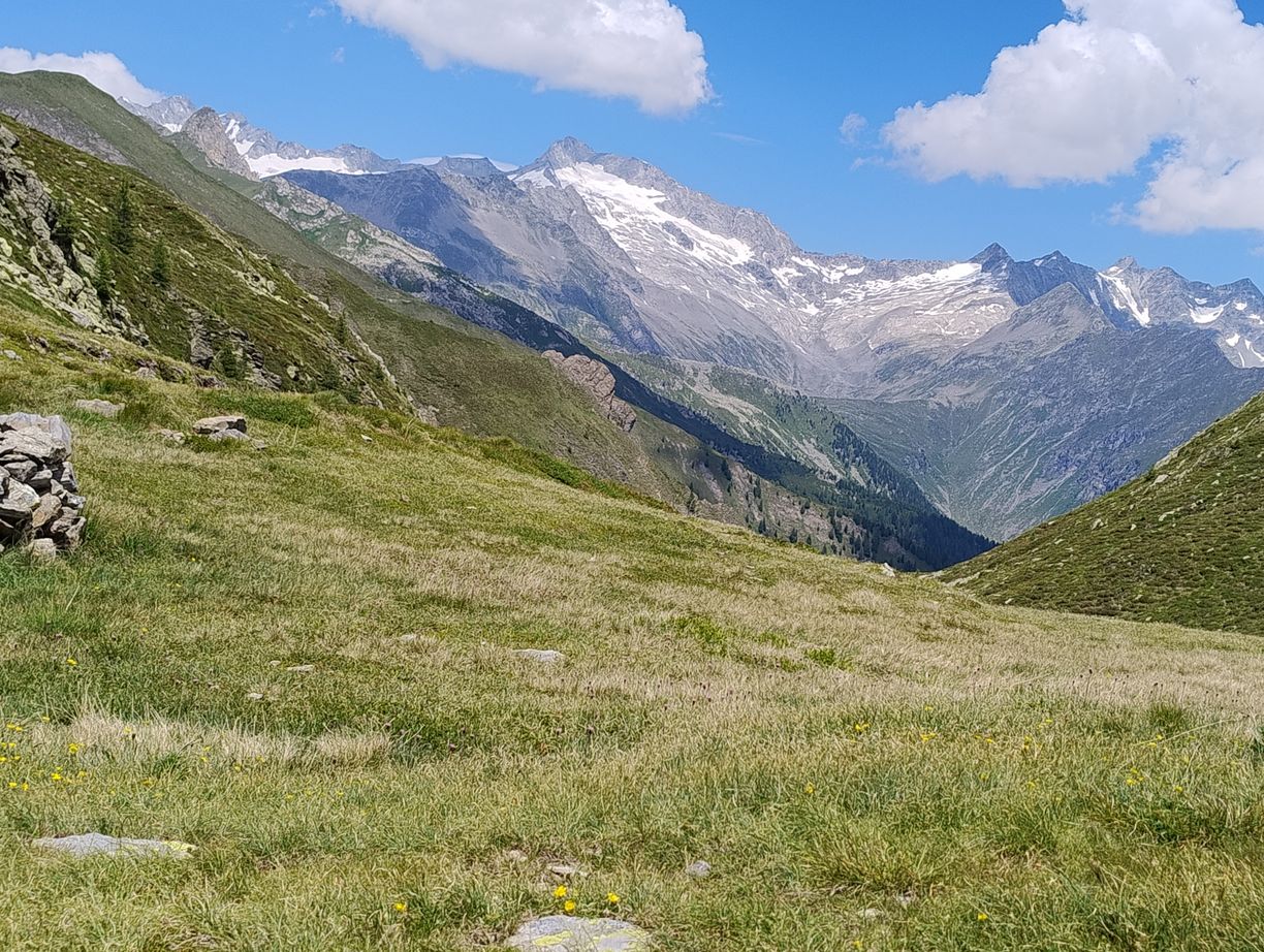 Cette fois-ci l’intoxication passagère semble toucher à sa fin, et je me présente au col de Mühlwalder Joch (2342m) dans un bien meilleur état. Je suis également aidé par le fait que le sentier est devenu beaucoup plus paisible. Je chemine désormais sur un terrain essentiellement plat, avec des vues magnifiques à 360 degrés, tantôt vers les Dolomites au loin, tantôt et plus près, vers les Alpes de Zillertal, la frontière italo-autrichienne et sa muraille de pics et de glaciers.