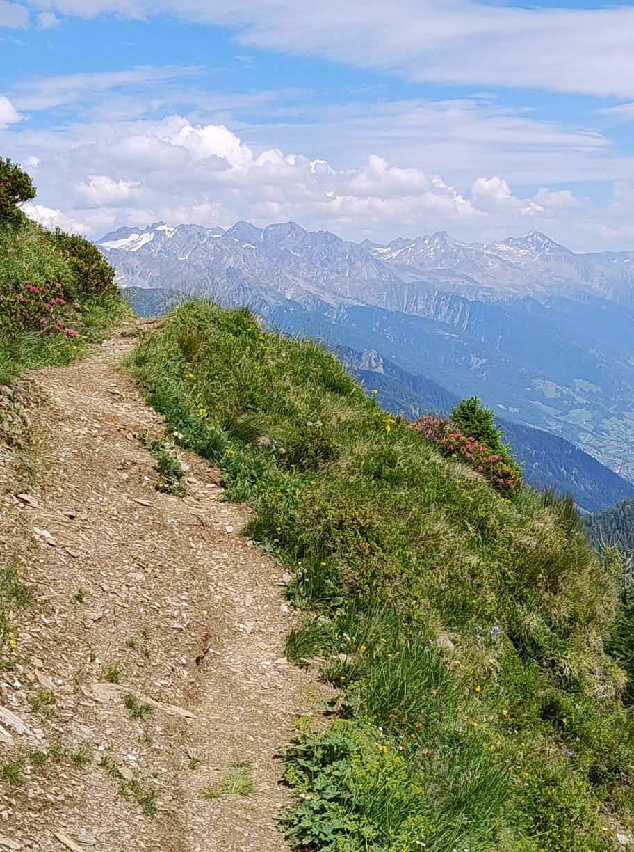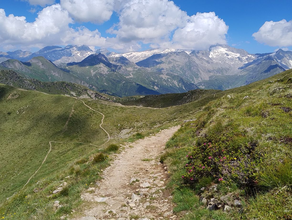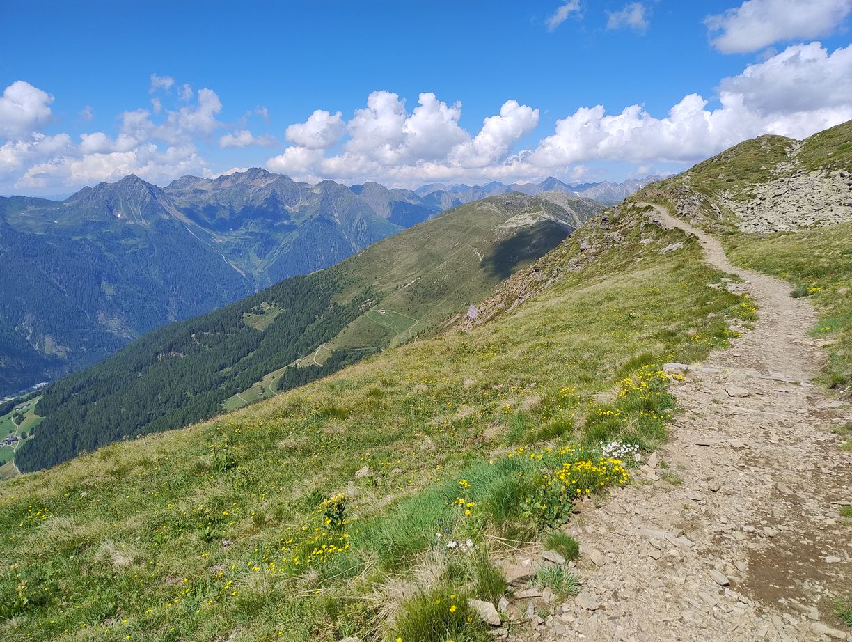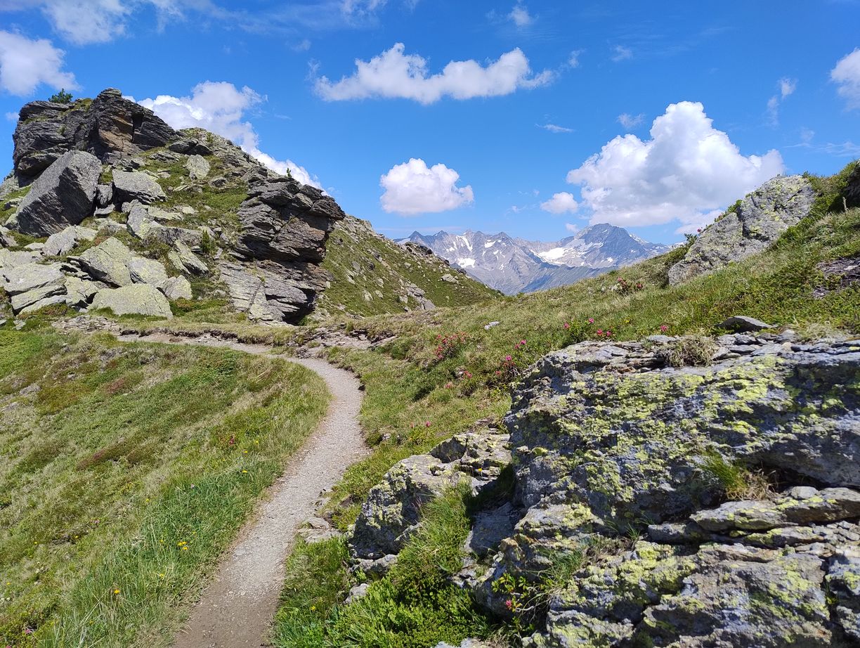Cette fois-ci l’intoxication passagère semble toucher à sa fin, et je me présente au col de Mühlwalder Joch (2342m) dans un bien meilleur état. Je suis également aidé par le fait que le sentier est devenu beaucoup plus paisible. Je chemine désormais sur un terrain essentiellement plat, avec des vues magnifiques à 360 degrés, tantôt vers les Dolomites au loin, tantôt et plus près, vers les Alpes de Zillertal, la frontière italo-autrichienne et sa muraille de pics et de glaciers.