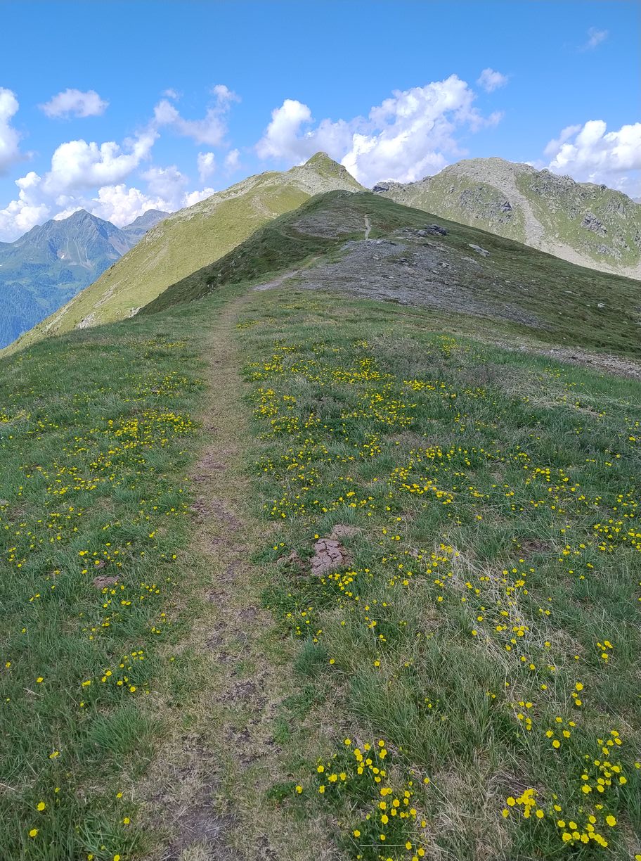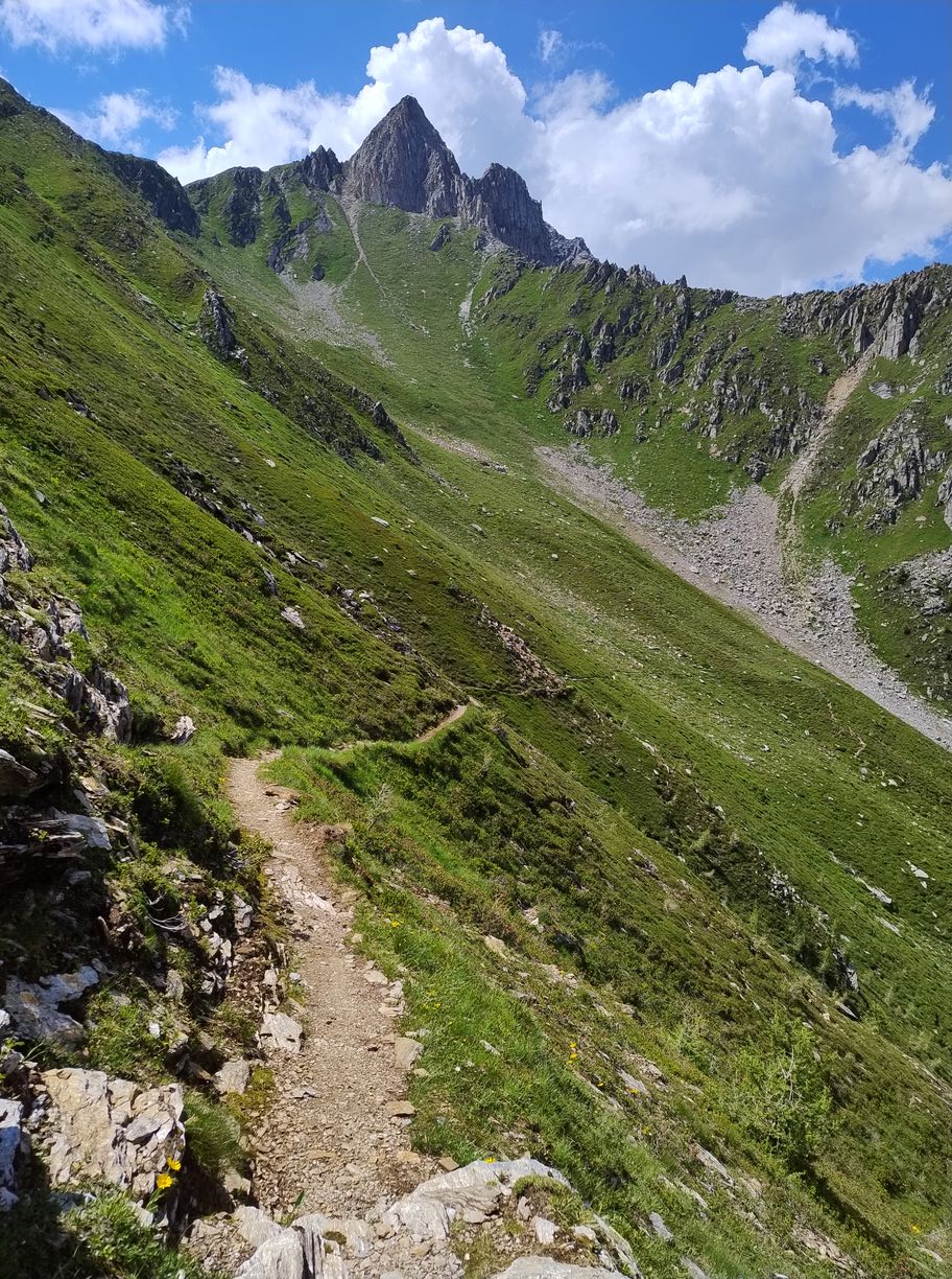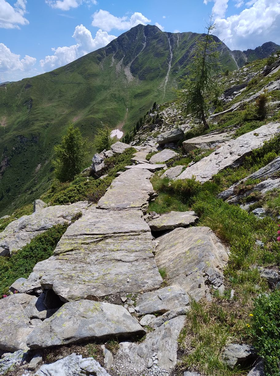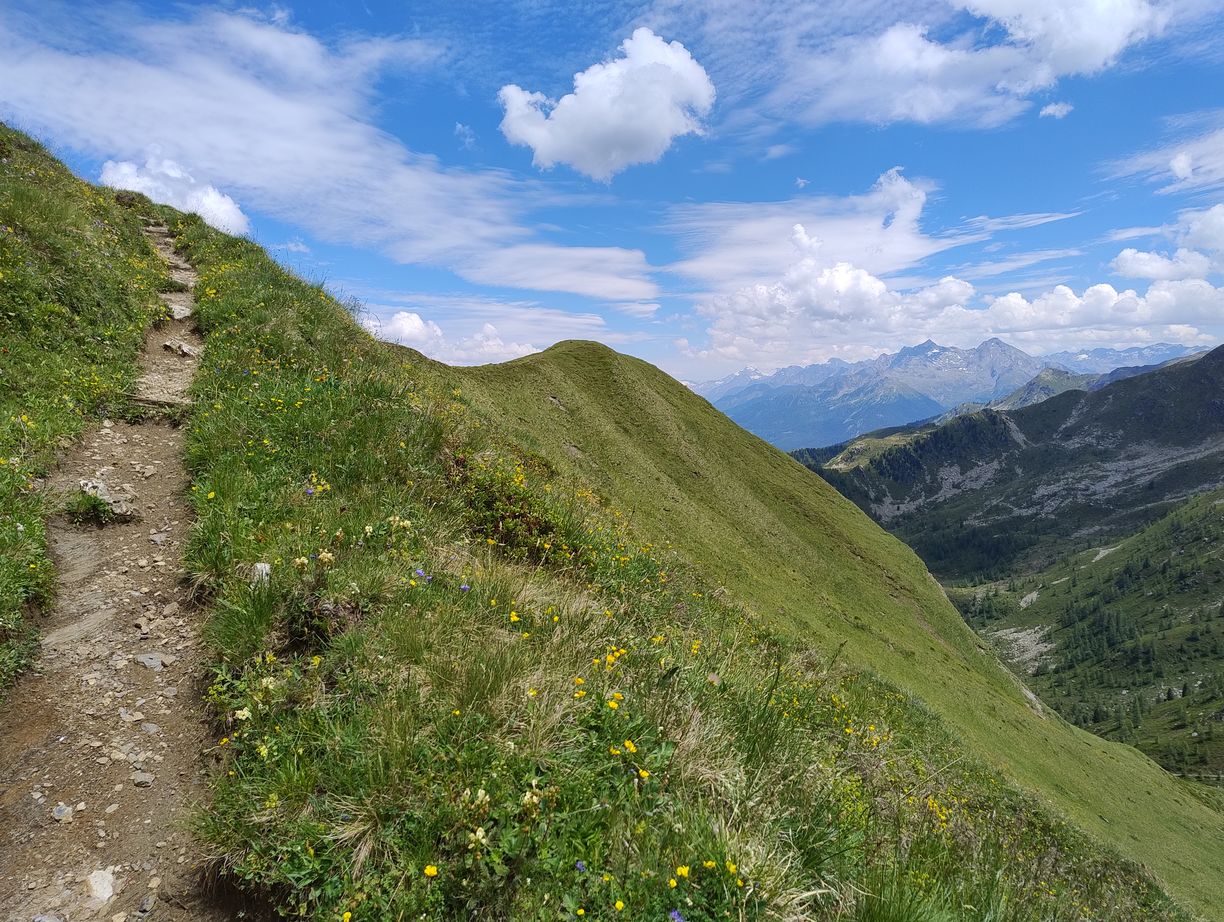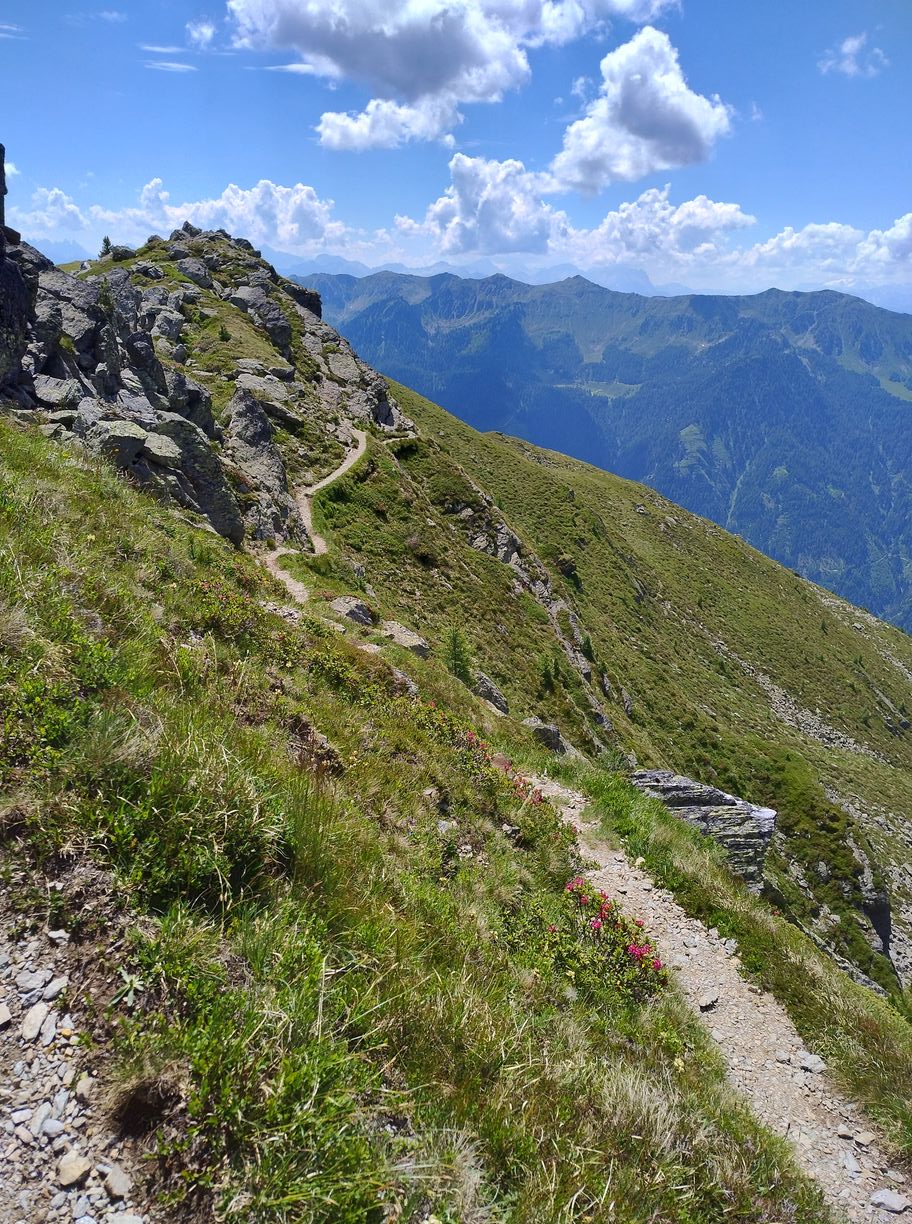 Sur la prochaine section le chemin en crête se transforme en sentier à flanc de montagne et à en croire la carte semble un peu plus heurté. Toutefois comme toujours je me fie au récit des précédents randonneurs, or personne n’a mentionné de difficulté particulière sur cette étape. Je suis donc un peu surpris quand au moment de passer sous le sommet du Zinsnock (2435m), le décor se fait abrupte, et le sentier oblique soudainement à gauche pour partir tout droit dans la pente. Le genre de passage raide où l’on grimpe en s’aidant des mains. Je me demande alors si le tracé n’aurait pas été modifié récemment, surtout que le “sentier” est assez bousillé et instable: c’est de la terre qui s’effrite sous les pas et ne tient pas en place. Vais-je conclure cette odyssée par une glissade et un rouler-bouler jusque dans la vallée? “Ci-gît le vieux schnock au pied du Zinsnock”, lira-t-on certainement sur une vieille pierre gravée. Heureusement ce début de panique ne durera que le temps de grimper 50 mètres afin de contourner par le haut un surplomb, au sommet duquel je retrouve un terrain un peu plus horizontal et croise alors…Fiona, la randonneuse suisse que nous avions rencontrée 2 jours plus tôt. Elle prend ici une pause panoramique depuis une position que je ne jalouse pas, le vide étant bien trop proche à mon goût. Nous conversons 2-3 minutes en partageant nos expériences respectives depuis la Rieserfernerhütte, elle m’informe qu’elle aussi a connu des problèmes gastriques (a-t-on bu la même eau ?), puis je repars en la laissant à sa contemplation.