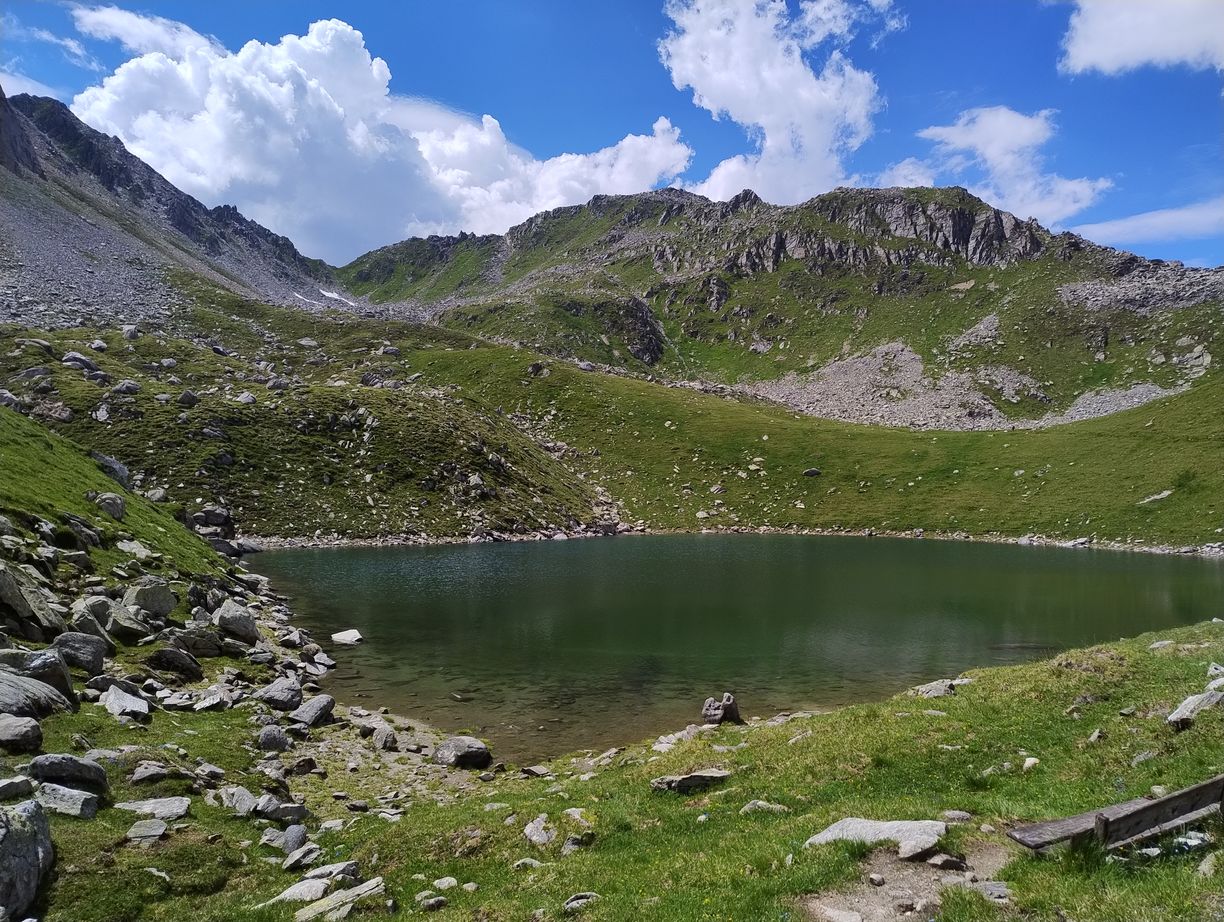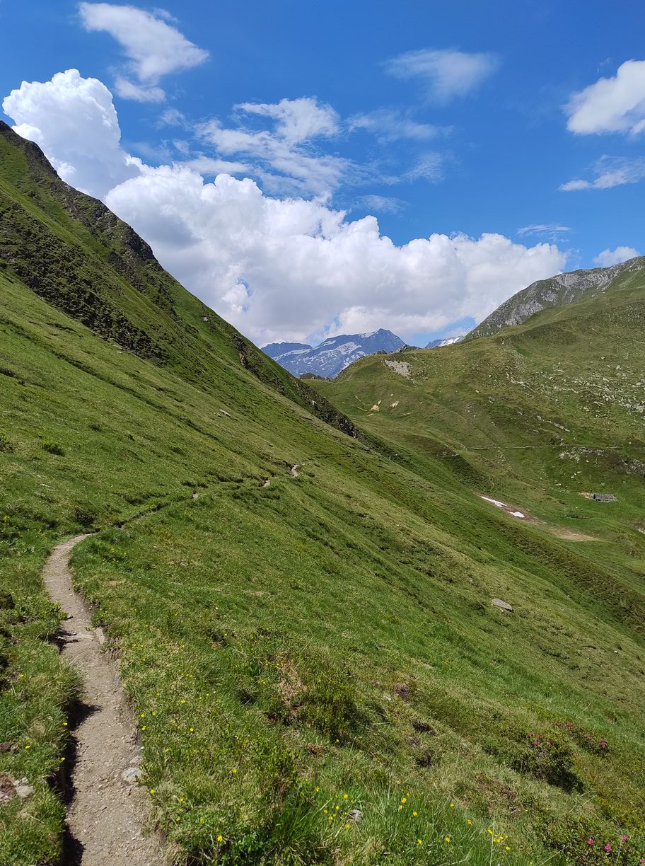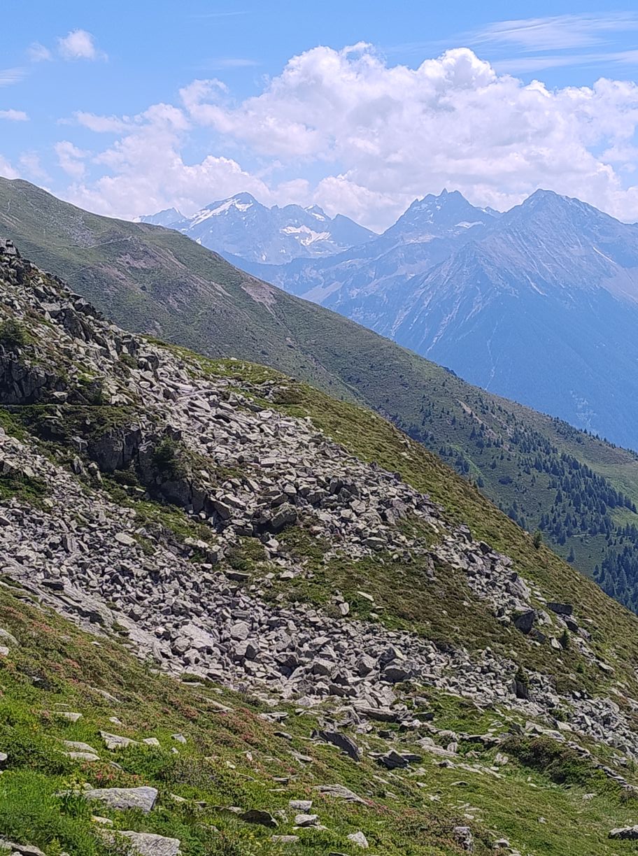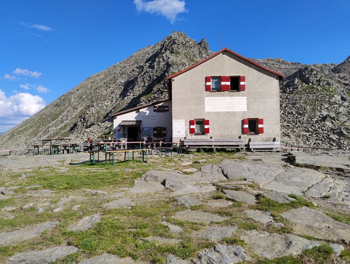 Arrivant au Gorner Joch je resens le besoin de prendre une vraie pause, il est 12h30, cela fait donc plus de 6h que je marche, et il m’en reste 2, ou maximum 3 : il n’y a rien qui urge. J’ai en effet cette fâcheuse tendance à m’inquiéter -inutilement- d’arriver trop tard à l’étape du soir, et à marcher d’un bloc toute la journée avec très peu de pauses pour finalement terminer à 16 heures : sans doute quelque chose que je pourrais (devrais ?) changer. Je profite alors de l’étendue herbeuse pour m’allonger et faire une mini-sieste d’une demi-heure. Il y a pire endroit pour roupiller par une belle journée du mois de juillet…Je tâche également de reprendre des forces en avalant quelques carreaux de chocolat, et replace négligemment la tablette ouverte dans mon sac à bouffe, lui-même placé en haut de mon sac à dos (la raison du « négligemment » expliquée dans quelques lignes).