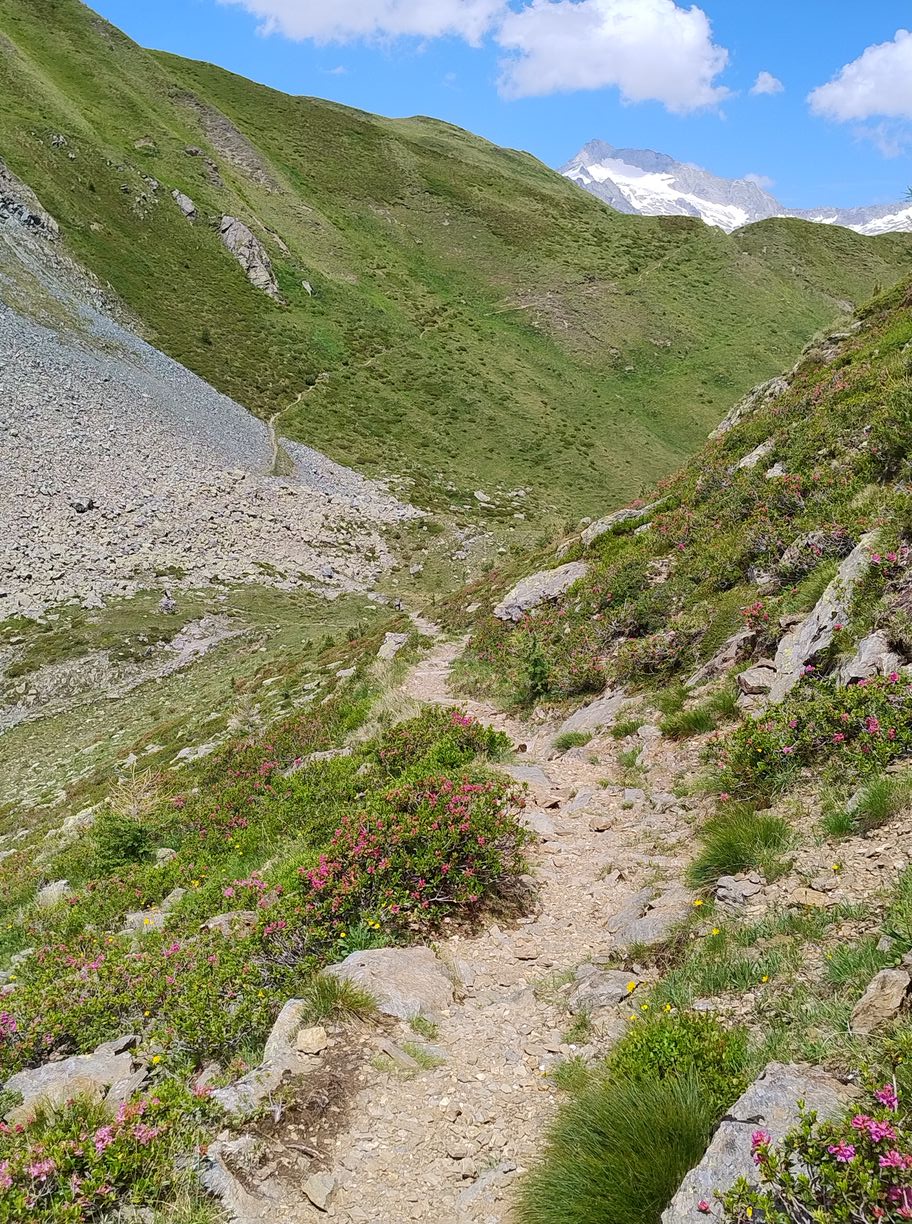 Je n’ai pas pour autant retrouvé mes jambes de 20 ans. Aussi pendant l’heure et demi qui suit, et alors que le sentier remonte lentement vers l’altitude 2450m avant de redescendre au col Gorner Joch (2276m), je m’applique à garder un rythme très doux. Dans cette partie je me trouve au plus loin de tout secours, ça n’est pas le moment de se rendre davantage malade…
