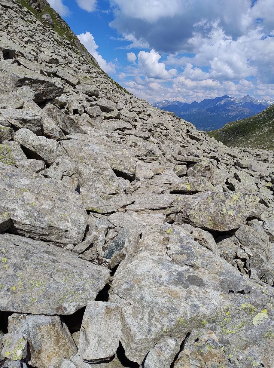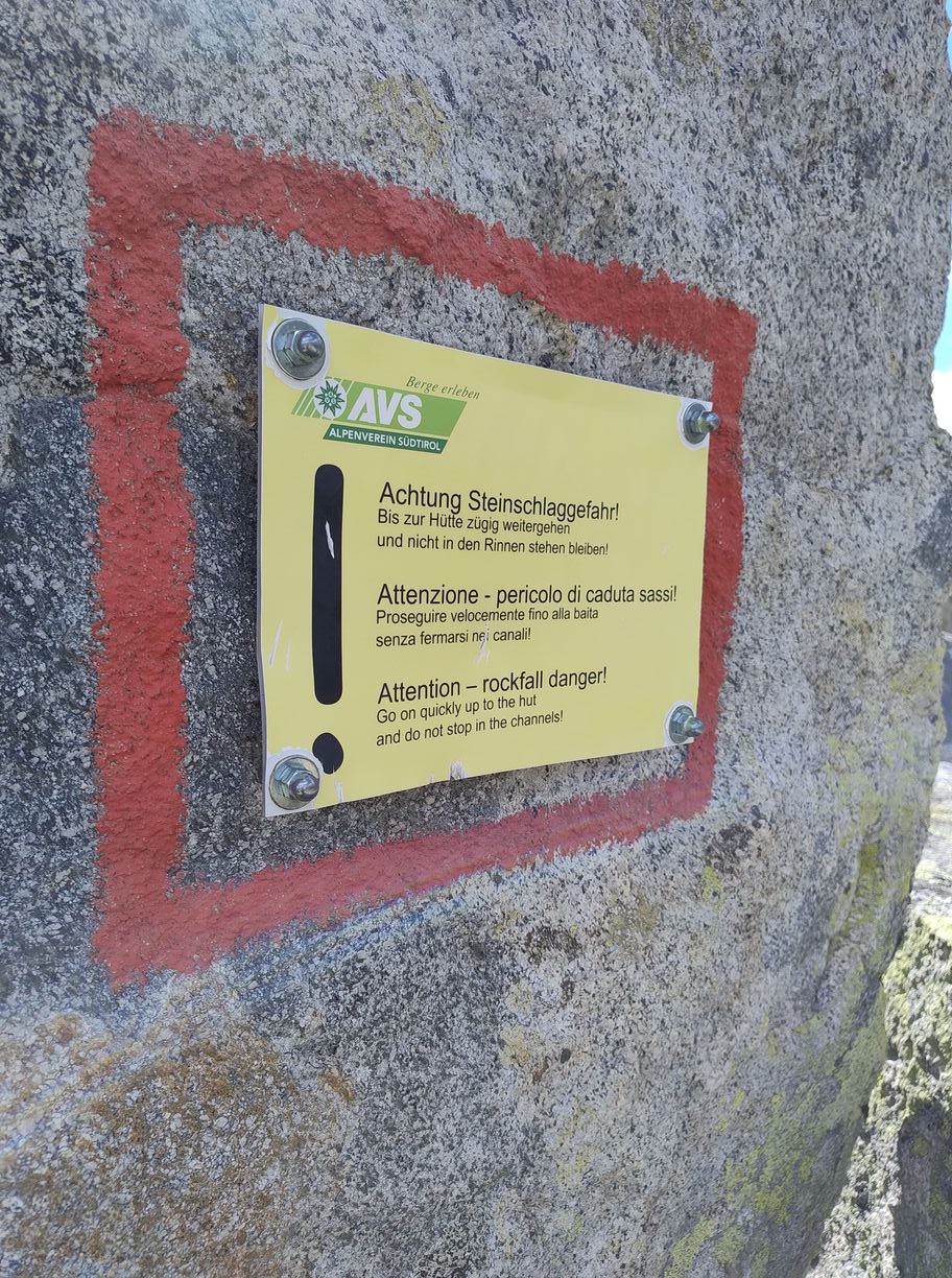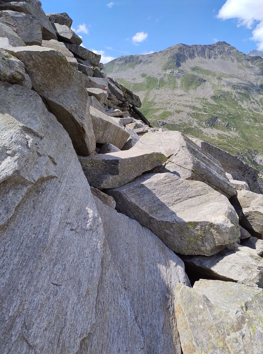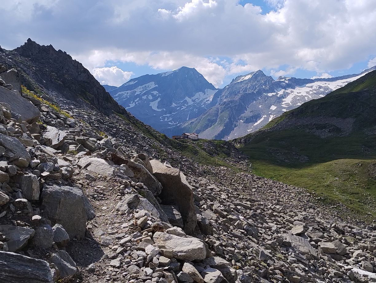 Pendant ce temps Fiona est arrivée, poursuivant notre chassé-croisé, et me demande si j’ai testé la baignade. A vrai dire malgré la chaleur ça ne m’était même pas venu à l’idée, le souvenir du malaise du matin étant encore trop présent. La perspective d’une bière au refuge avec mon bouquin me parle davantage ; et tandis qu’elle se jette à l’eau je reprends la route en nous donnant rendez-vous là-haut (où finalement nous n’échangerons pas davantage, car elle y retrouvera une comparse elle aussi germanophone : n’en parlant pour ma part pas plus que 3 mots je les laisserai à leur discussion). Il n’y a pas long -en principe- entre le lac et la Chemnitzerhutte, mais la méfiance est de mise car d’après plusieurs retours le chemin dans son ultime segment est assez ardu. Et effectivement à moins de 2km du refuge je pénètre dans un chaos de rochers, une pancarte alerte même du danger et invite le randonneur à ne pas traîner sous ce couloir d’éboulement. A voir la taille des cailloux qui pourraient me tomber sur le crâne, je n’ai aucun mal à obéir à l’injonction. En d’autres circonstances, déambuler dans ce labyrinthe à la recherche du meilleur passage pourrait être une activité divertissante, mais après presque 25km et 2000m de D+ j’ai plutôt envie que ça se termine vite. Alors que cette traversée me paraît durer une éternité, je croise d’autres randonneurs venant en sens inverse qui semblent peiner encore davantage, et suis rassuré de constaster que je ne suis pas nécessairement le moins dégourdi…Il me faudra tout de même presque une heure pour franchir ces 2 derniers kilomètres, et au prix d’un dernier effort dans une ultime montée finale, j’arrive enfin au refuge peu après 16 heures. Ouf.