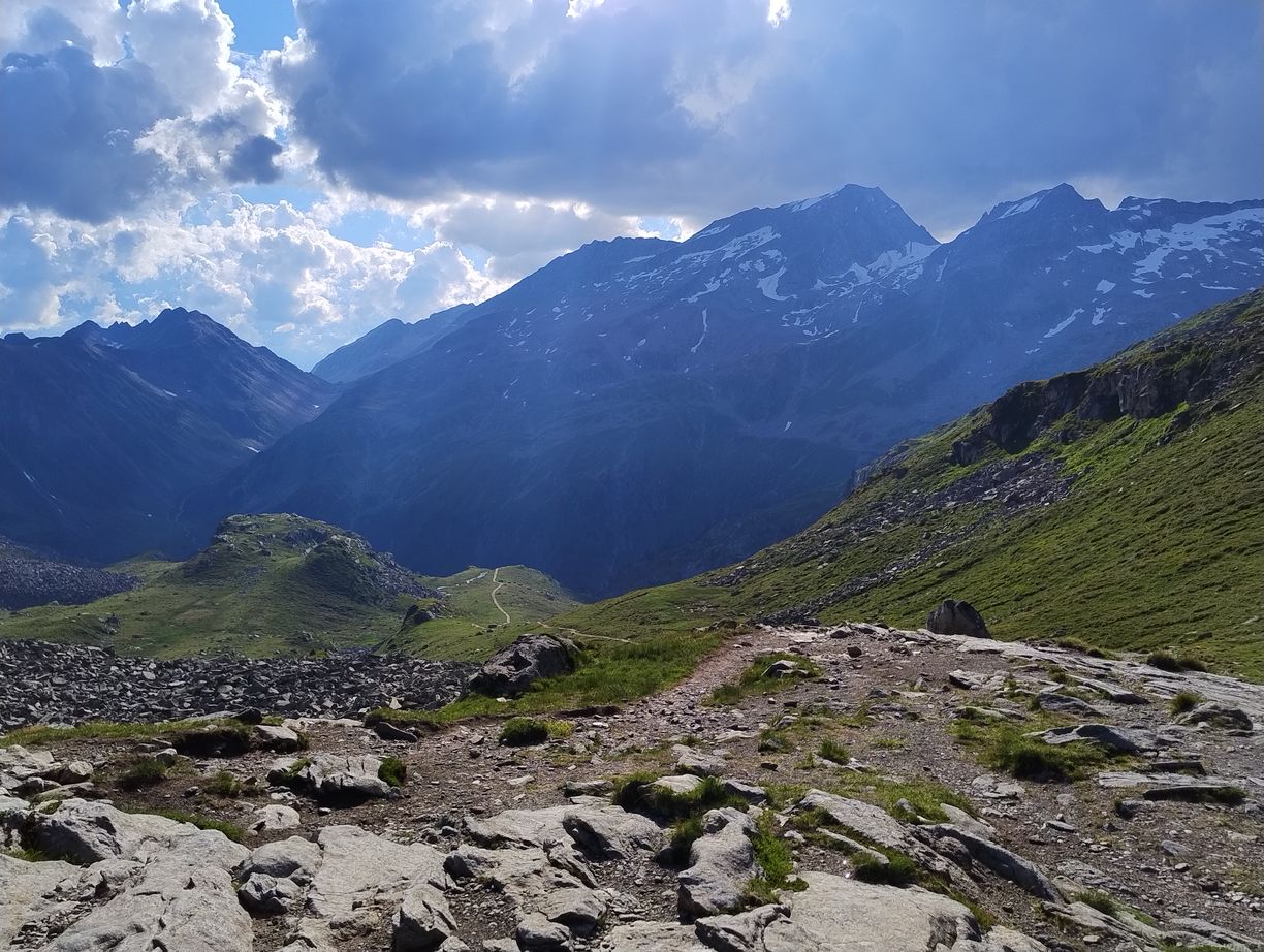 En m’installant dans le dortoir je fais également la connaissance de Dirk, un alpiniste allemand qui semble avoir environ la cinquantaine. Son projet pour les vacances est de gravir en solo les sommets du coin. Pour ce faire il se déplace de refuge en refuge, dans lesquels il établit son camp de base pour 2 à 3 jours, puis fait des aller-retours dans la journée vers une des nombreuses cimes à plus de 3000 mètres qui séparent ici l’Italie de l’Autriche. Il est arrivé hier à la Chemnitzer Hütte, et demain il partira vers un nouveau sommet avant de s’installer le soir dans un autre refuge. Il s’excuse d’avance du possible bruit car demain matin il compte partir à 04h30, je le rassure en lui disant que je n’ai pas d’habitude de difficulté à me rendormir. Je le questionne un peu sur les conditions de neige et les glaciers en haut, à ma grande surprise il me dit que cette année la fonte n’est pas forcément plus précoce que les autres, mais est bien d’accord avec moi sur le constat tragique qu’en 2050 ils ne seront plus là. Je passe ensuite la soirée à me reposer, prendre des photos dehors, chose rare je m’offre aussi le luxe d’une douche payante (4 euros), puis enfin je savoure un plat de pâtes qui mérite à lui seul la montée. En Italie souvent pas de sauces grossières, mais uniquement un savant dosage de condiments, tomates, herbes et huile d’olive…c’est délicieux. Dans la salle commune nous serons visités pendant le repas par un groupe de traileurs italiens assez joyeux et bruyants, visiblement des habitués des lieux, et que je verrais enchainer 4 à 5 grandes bières avant de finalement entamer la descente vers la vallée alors que le soleil se couche déjà, au pas de course et frontale vissée sur la tête. Il y en a qui ont la forme ! Quant à moi, après une telle journée je n’aurais pas besoin d’autant d’alcool pour trouver le sommeil, et c’est de bonne heure et avec bonheur que je rejoins ma couche…
